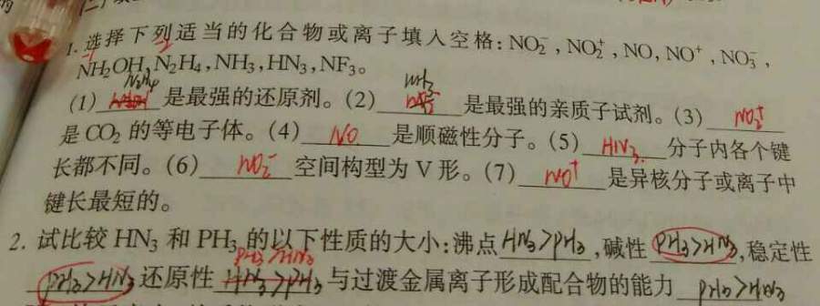 大神帮我看看,第一题的第一个空,为什么联氨是最强的还原剂,我觉得羟氨才是,第二题的第二个空,第三个空都不对,叠氮酸不是容易爆炸吗,稳定性还好吗,求指教 发自小木虫Android客户端 |