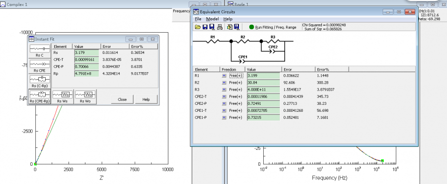 大家好,我是刚刚学习电化学的一名同学!现在正在拟合电化学阻抗谱。 自己拟合方法是先进行低频区的即时拟合,在高频区的即时拟合,最后把两个区域的拟合数据输入到如图1所示。 遇到的问题是:①R3拟合好后的数据误差特别大。 ②我这样的拟合方法对吗? ③如何更准确的拟合呢? 原数据文档已经上传,如果哪位仁兄能帮忙拟合,非常感谢 1.PNG |