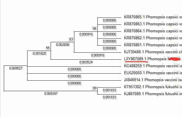 如图,求助各位大神,我提取的植物真菌DNA经过Blaste比对后确定是phomopsis capsici,但建的系统发育树以后发现它与我的菌种不是同一个分支,我的菌种(标红)是单独的分支,想问问大家这是怎么回事 发自小木虫Android客户端 |