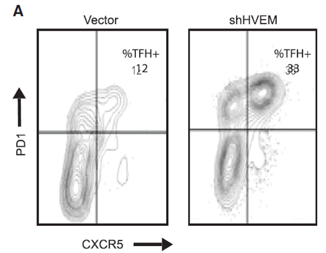 Tfh cells are generally characterized by their expression of the chemokine receptor CXCR5, the transcription factor BCL6, and the inhibitory molecule PD-1. Stained cells can be analyzed directly by flow cytometry. Tfh cell sorting for use in downstream applications is also possible using CXCR5 and PD-1 staining 意思就是说用流式细胞检测细胞表面这两个蛋白的表达来看Tfh细胞在总细胞中的比例。可能RNA干扰对Tfh的分化有影响吧 |