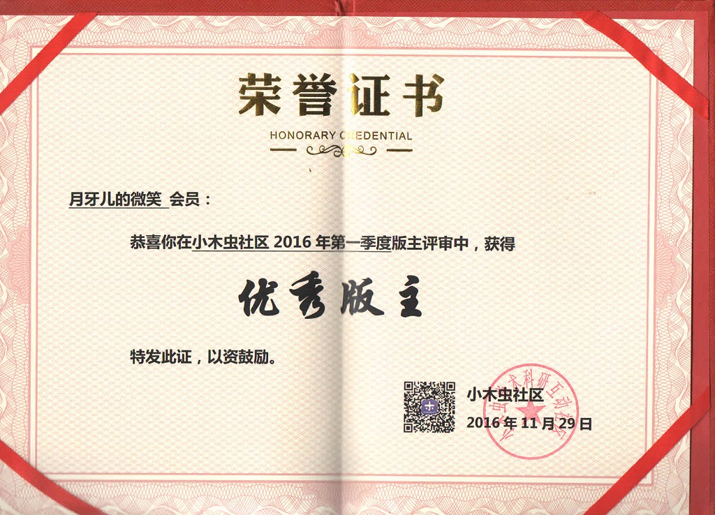 恭喜【月牙儿的微笑】获得2016年第1季度优秀版主
