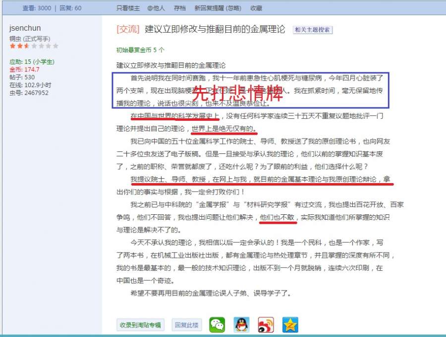 今日有虫友反映 @jsenchun 所发帖子有虫友举报说“有哗众取宠的问题”。 由于小子所学是生物功能材料出身,对于金属材料所知甚少,水平有限,不敢妄加评论,在此开帖置顶请诸君共同讨论,为期3天。 小木虫的版主(包括区长,超版等)与专家顾问都是在网上义务为大家服务,没有现实中工资发放,时间有限,不能从2013年帖子挨个验证不得已采用这样的方式,还望诸君见谅。 对于该虫友的探索精神小子以为还是应当予以肯定,但是科学之所以是科学,不是某某人以为自己是对的就是科学了。 科学是需要“大胆假设,小心验证”哒。没有小心验证的情况下的大胆假设仅仅是假设,不能称之为科学理论。 该虫友在2013-05-19发帖《当前金属材料教科书基础理论的错误》:http://muchong.com/bbs/viewthread.php?tid=5913064 该帖提出了很多目前金属材料基础理论错误,小子水平有限,时间有限不能一一验证真伪,在此深感遗憾。 对于近日该虫友在2016-11-21帖子《关于相变理论》中回帖:http://muchong.com/bbs/viewthread.php?tid=10785532&pid=27#pid27 小子不得不提出三个问题,还望该虫友回答,诸位虫友来一起评判: 其一、 @jsenchun 您的理论在哪里?小子目前条件所限还望给予小木虫相应帖子链接,或者直接在回帖中系统地说明。 其二、 @jsenchun 您的理论证据在哪里?小子目前条件所限还望给予小木虫相应帖子链接,或者直接在回帖中明确地说明。 其三、 @jsenchun 小子在此有个私人的小问题:援引自:http://muchong.com/bbs/viewthread.php?tid=9377778&pid=5#pid5的问题 还望 @jsenchun 您能在近期(三天内)抽出宝贵的时间回答其中的部分问题。 小子以为,理不辩不明,摆事实,讲道理,大家都是自认为的知识分子,还是能够把争论说清楚的。 当然,对于违反版规的任何行为,小子会按照http://muchong.com/bbs/viewthread.php?tid=10369476&fpage=1严肃处理。 |