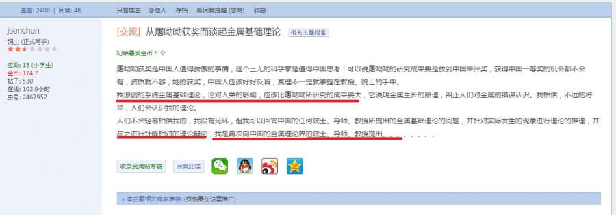 只说一句:上帝的归上帝,凯撒的归凯撒。学术的也要归学术,学术强调证据、强调论证,还有强调学术共同体的承认,承认的重要方式就是在相关领域的杂志发文章 发自小木虫IOS客户端 |