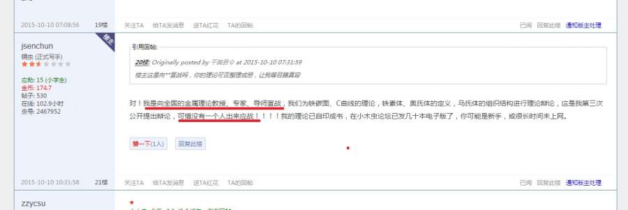 目前是关于帖子:http://muchong.com/bbs/viewthread.php?tid=5913064 的发帖者需要自证“其对现有理论评论的理论依据”。 小子以为,事件不是: 而是甲方对现有理论提出诸多评论:《当前金属材料教科书基础理论的错误》 http://muchong.com/bbs/viewthread.php?tid=5913064 之后一直在小木虫材料区金属板块争议不断。 乙方要求甲方对《当前金属材料教科书基础理论的错误》予以证明。 |