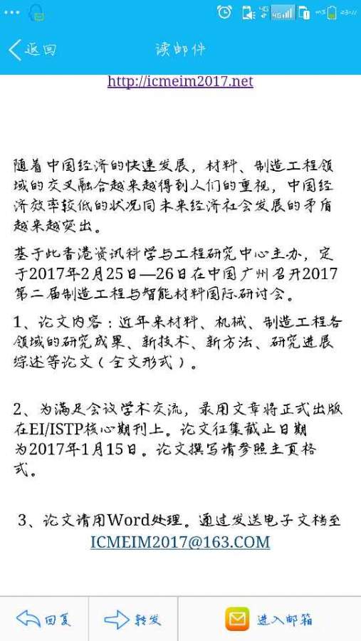 不知道这算什么,本人今年研一,并没有发表过什么成果,但今天却收到了这样的邮件,不知道算不算是约稿。百度了ICMEIM,只出现了ICMEIM2015,应该是第一次会议,而这显然是第二次会议的征文活动。虫友们怎么看?还有就是百度了任卫平这个人,出现的词条是辽宁大学外国语系教授。不知道该怎么办的小虫友,希望大家给点意见。 发自小木虫Android客户端 |