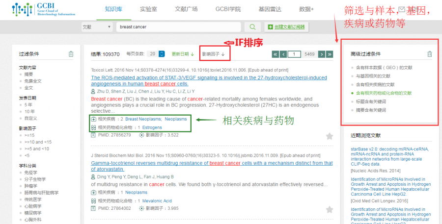 现在主流文献搜索都是用pubmed和谷歌学术,至少对我自己而言 后来做生信分析发现GCBI也有文献检索,用了之后觉得还不错 最大的两个亮点莫过于可以用IF排序,及强大的高级检索能力 在高级文献检索中,可在检索结果中筛选含基因,样本,疾病或药物的文献,而且搜索结果中直观看到 样本,基因,药物都是和NCBI链接的 如想了解乳腺癌的药物治疗研究进展,直接搜breast cancer,再用高级检索直接晒含药物的文献即可 强烈推荐,可以一试 GCBI官网 www.gcbi.com.cn 1.png |