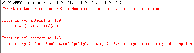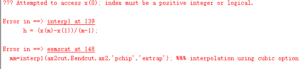 你并没有给出具体数据,原代码中是要求给出输入的。 原代码中已经说明了如何调用这段程序并给出了例子: 把原m文件保存在MATLAB当前运行目录中,在主程序窗口,先输入X,然后调用: NewEEM = eemscat( X, [20 20], [10 10], [10 10]); 其中特别要注意对输入的要求: 其中 X必须满足: X-array of EEMs. X is size IxJxK, where I is number of % samples, J emissions and K excitations. X has to be a % dataset object where the axisscales contain wavelengths. 如果现有X的数据格式不满足:You can convert an array to a dataset doing % X = dataset(X); % X.axisscale{2} = EmAx; % The emission wavelengths (nm) % X.axisscale{3} = ExAx; % The excitation wavelengths (nm) % 对于输入量: RayeleighWitdth % RayeleighWitdth is a two-element vector defining how many nanometers % to the left and right of the Rayleigh center is removed. Use % [0 0] to avoid removing. Default if not given is [25 25]; % % 对于输入量: RamanWidth % As above but for Raman. Default is [0 0]. Assumes water samples % (for the position of the Raman scatter) % 对于输入量: Rayleigh2Width % As above but for second order Rayleigh scatter. Default is none % [0 0]. % % %%%%%%%%%%%%%%%%%%%%%%%%%%%%%%%%%%%%%%%% % Example: |