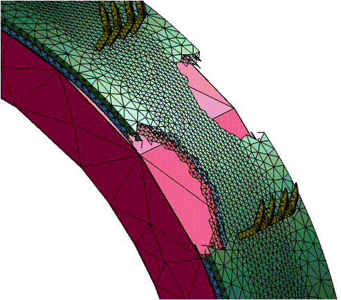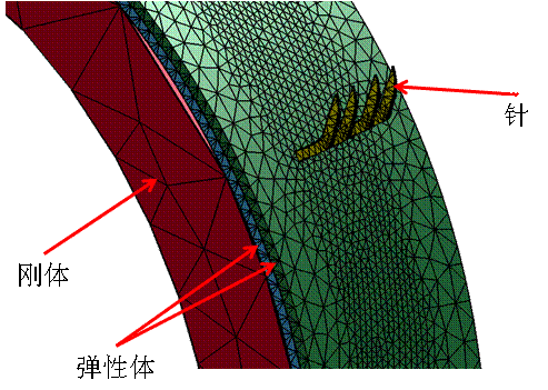 如图,一个刚体辊子上套着两层弹性体。针插在两层弹性体中。在刚体上施加角速度载荷并在刚体与弹性体之间设置接触。计算后刚体转动,但是弹性体却出现了如图2所示的现象,这是什么原因呢?我并没有设置单元删除。k文件一并上传,但是文件比较大。 模型.gif 刚体转动后.gif |