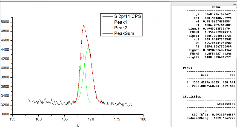 首先你的S 2p谱图的分辨率不高,看不到2p峰的分裂,这也给解谱带来了困难。另外,解谱时用一个高斯峰作为p型峰也是不对的,应该用P型峰来拟合。建议你先得到高分辨谱图再去解谱
