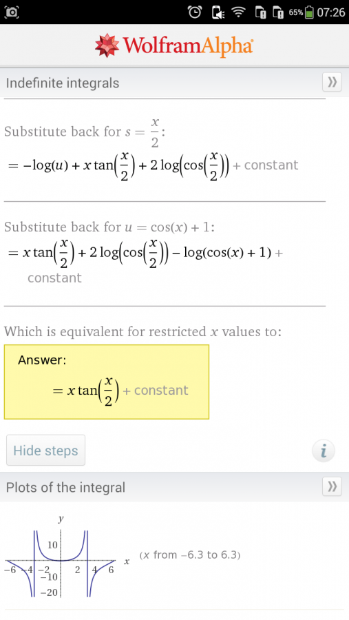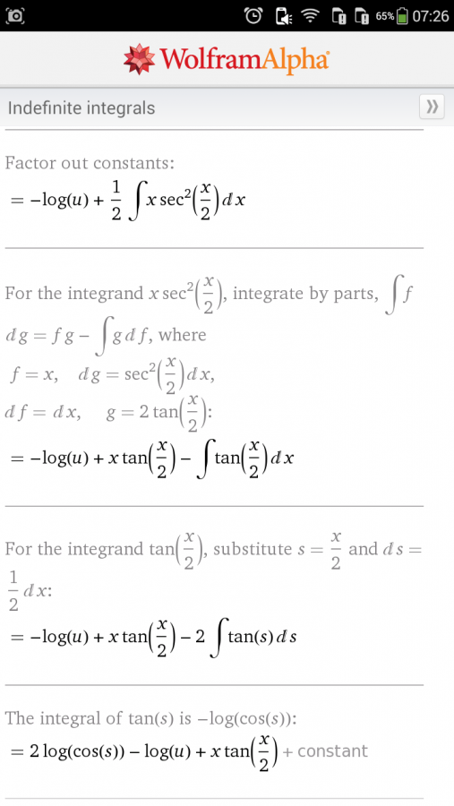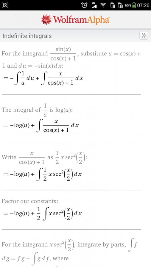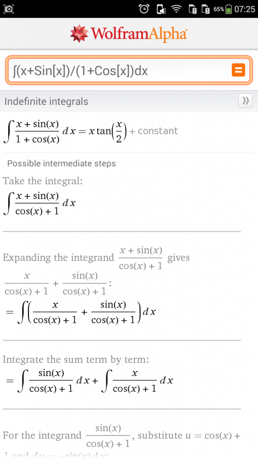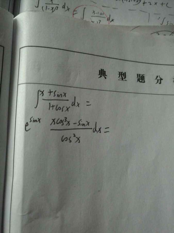 \frac{x+\sin x}{1+\cos x}dx=\frac{x}{2\cos^2(x/2)}dx+\tan\frac{x}{2}dx=x\sec^2\frac{x}{2}d\frac{x}{2}+\tan\frac{x}{2}dx=xd\tan\frac{x}{2}}+\tan\frac{x}{2}dx=d(x}+\tan\fr ...