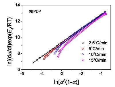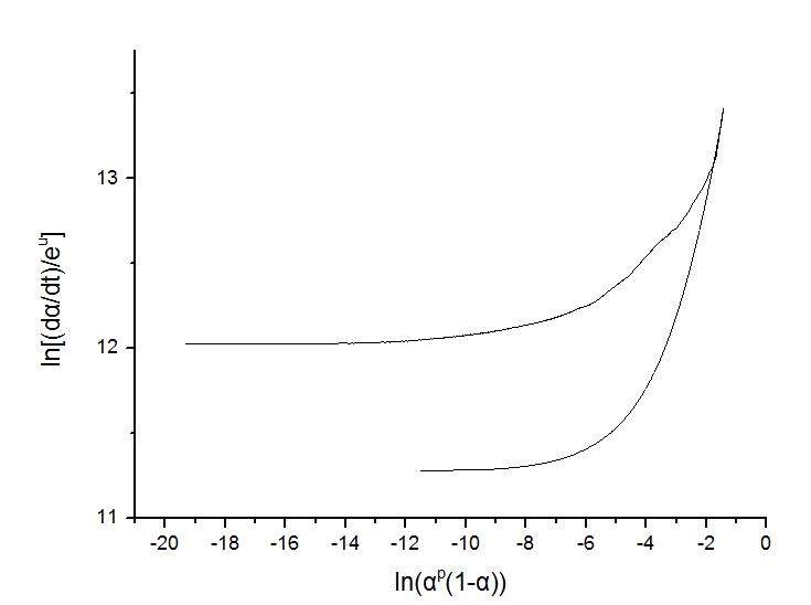 利用Malek法作图得出了αM和P,选用Sestal-Berggren模型,在做ln[(dα/dt)/eEa/RT]--ln(αp(1-α))曲线时,为何一个X对应两个Y,看文献都是接近直线可以直接拟合的。。如图分别为我做出来的图和文献的图,请问大神那边出了问题,已经算了好几遍了,都是这样。图中u=Ea/RT