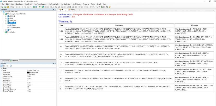 刚接触相图热力学计算,在试用pandat2016 Demo 软件的时候,不知道怎么回事,Al-Mg-Zn、Al-Mg 的example.tbd数据库文件导入总失败,且提示自由能G不连续,这是怎么回事? 错误提示.JPG |