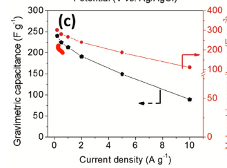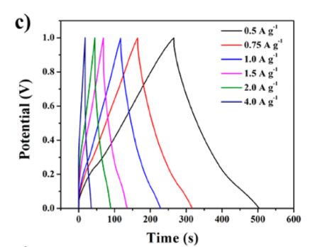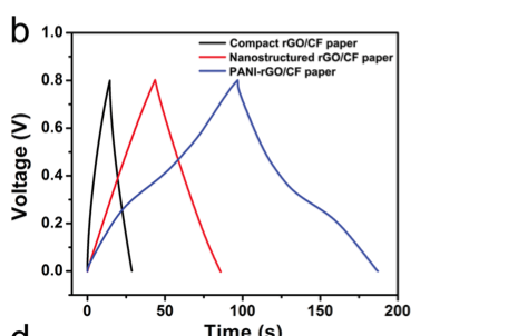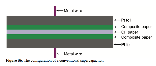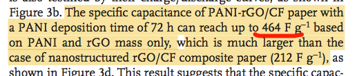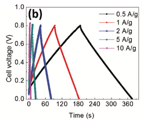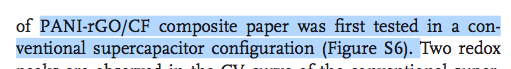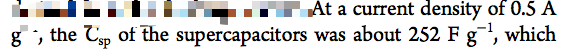 大牛请留步。。。。。。。下面问题绝对值得你解答。 单个电极的比电容计算方法有两种: 1.三电极,三电极测的是单个电极的比电容。根据GCD曲线计算比电容是Cs=I*tmV,I/m是电流密度A/g,t是放电时间,V是电势力窗口。应该对吧? 2.双电极。 2.1第一个问题,用双电极测组装的电容器,出来的GCD曲线是指整个电容器的还是单个电极的? 2.2第二个问题,如果gcd曲线是测单个电极的,那么GCD曲线计算比电容是Cs=2I*tmV,I/m是电流密度A/g,t是放电时间,V是电势力窗口.对否? 2.3针对第二个问题,我查了一篇文献Cellulose Nanofibril/Reduced Graphene Oxide/Carbon Nanotube Hybrid Aerogels for Highly Flexible and All-Solid-State Supercapacitors。里面提到: 图 根据上面公式Cs=2I*tmV,计算0.5A/g,比电容应该是252左右(这个应该是单个电极的比电容,如果是整个电容器的话乘以4后得出的单个电极比电容太大啦),和下面文章提到的一致; 2.4 验证。我找了另外一篇文章:Nanocellulose coupled flexible polypyrrole@graphene oxide composite paper electrodes with high volumetric capacitance。 2.5困惑。下面是第三篇文章Nanostructured Graphene Composite Papers for Highly Flexible and Foldable Supercapacitors。 D2A05D6B-38A1-4B1D-ACEC-9B2F26A660FA.png@langzhizhou |