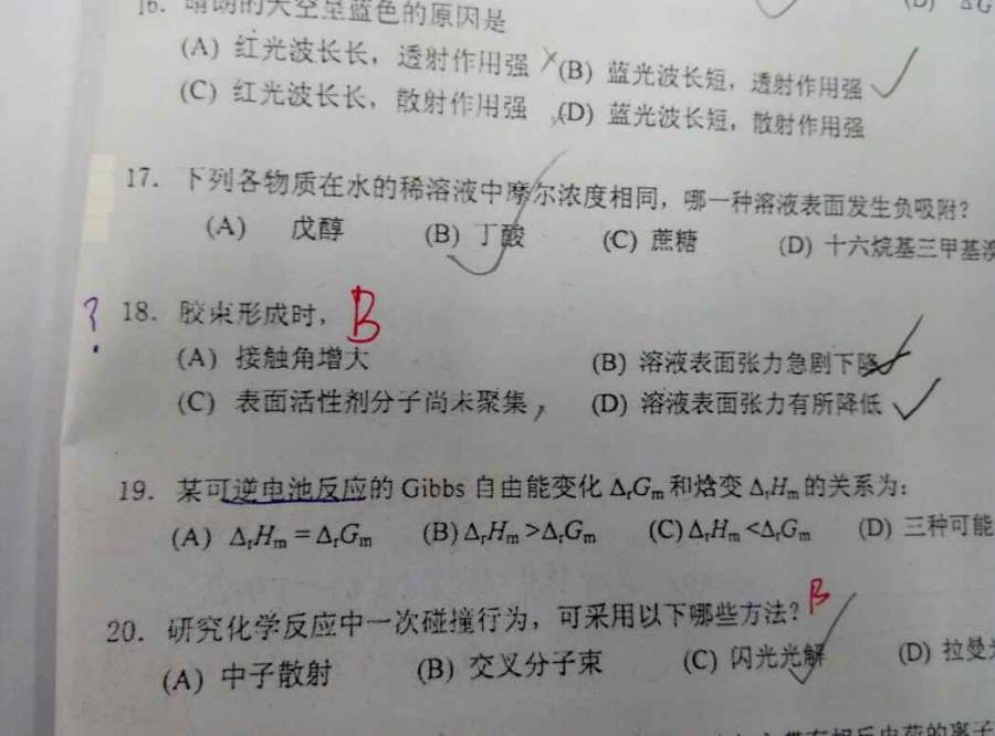 第一张图片里的105题,解题方法应该是利用阿仑尼乌斯方程,把乘除的关系化成指数位置的加减关系,但是括号里面的分母位置有个2,不知道应该怎么处理? 第二张图片里的第6题,没有一点思路… 第三张图片里的18题,答案给的是B,感觉好像给错了,表面张力不应该急剧下降吧? 发自小木虫Android客户端 |