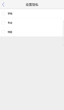 3、增加个人隐私选项:目前支持学校、地区、专业三项是否对外公开设置,勾选表示为隐私项,不对外公开,反之公开