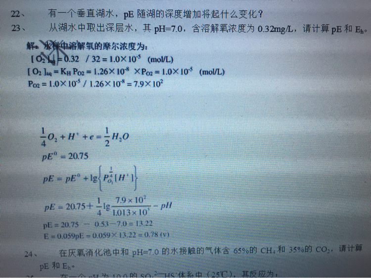 前两天做了一道比较简单的环境化学题,让我百思不得其解的是给的答案的方法,想不太通!题目如下: 从湖水中取出深层水其PH=7,含溶解氧质量为0.32mg/L的请算出PE 按照我平常做题的常法来做肯定是用亨利定律求出分压来做,而给的答案并不是这样的,然而用我们常法来做我算出来两个答案的偏差很小,看到他给的答案时,思路按照他的思路来,当时想:“难道是地下深层湖水不适用亨利定律?”后来想想亨利定律适用这种情况呀!那么用常法来做也相差不了多少,那么说有一定得合理性,就是想不明白,查了文献,也没有找到满意的回答,各位虫友,能不能给小弟点播一下,嘿嘿 图片对应25题 发自小木虫Android客户端 |