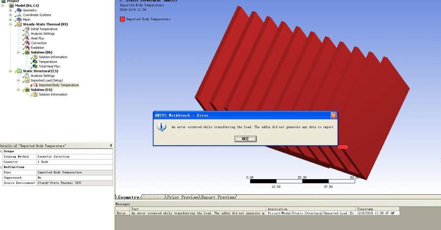 workbench 中 温度场分析完成后,温度场数据数据无法从Steady-State Thermal模块导入热应力分析Static Structural模块,显示无法生成数据,求各位帮助解决 未命名.JPG |