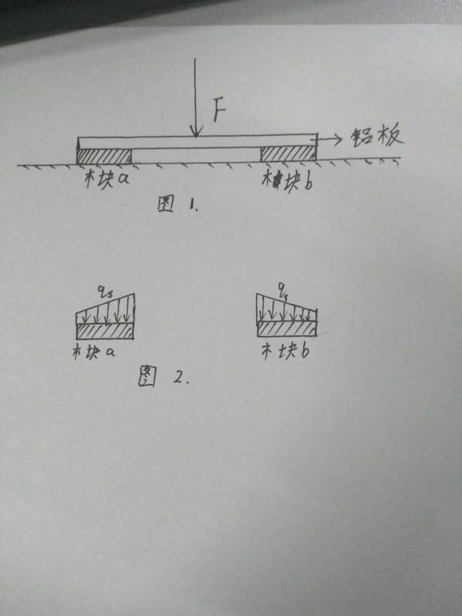 图1是例子,力F施加在铝板上,铝板下放置相同的木块a、b。 问,木块a、b受到铝板的压力如图2中描述的吗(即木块a左端受到的压力小于右端受到的压力)?、 备注:一切都按照实际情形考虑,没有刚体。 634154561455921785.jpg |