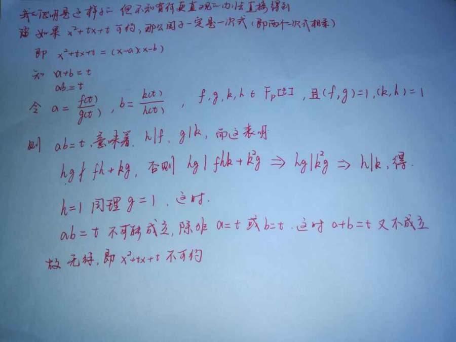 F=Fp(t)为一个素域(特征为p的域)的有理分式域,则x^2+tx+t不可约?