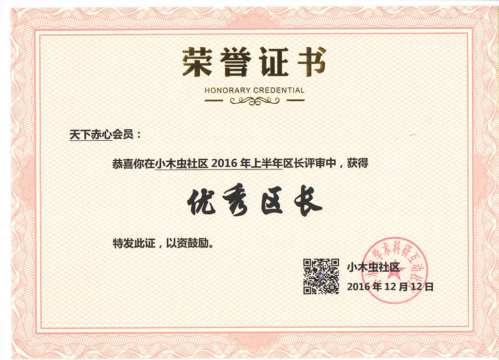 恭喜【 天下赤心】获得2016年第4季度优秀区长