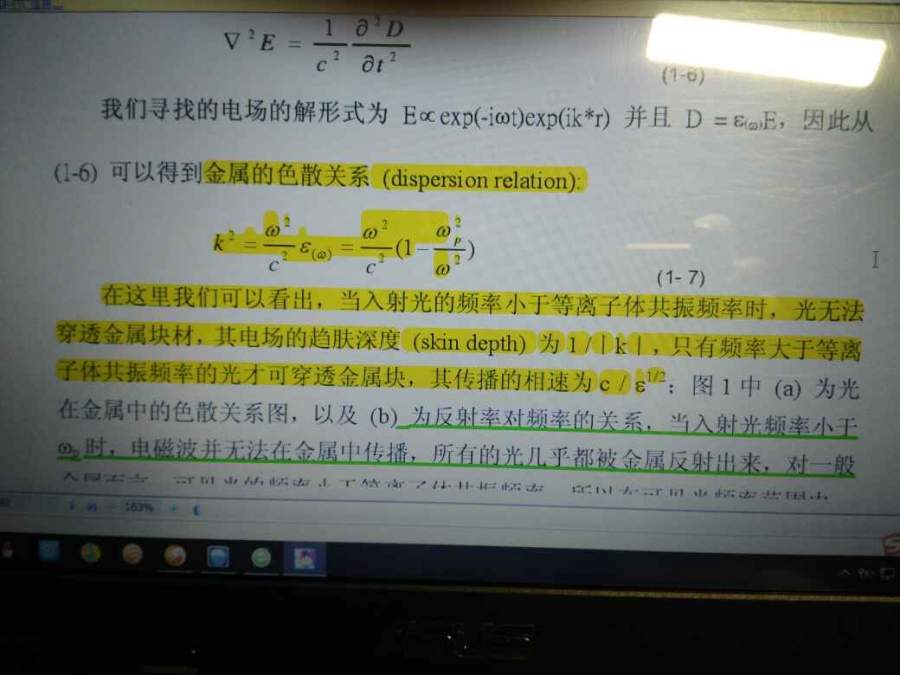 1、色散与反射率、透过率是有关系的, 金属为色散材料,在不同频率下,金属的折射率不一样,会影响到反射率、透射率。 2、“文献中看到金属的色散系数k小于0时,光无法穿透金属,怎么理解呢?” 这句话有问题,不知道你在哪一篇文献中看到的? 这里的意思是, 1)当W<Wp(入射光频率小于等离子体共振频率)时,K^2<0,此时,K为虚数, 再代入上边电场的解形式,K为虚数时,最后一项呈e指数衰减(有倏逝波的特征),振幅很快衰减为0,故不能通过。 2)当W>Wp(入射光频率小于等离子体共振频率)时,K^2>0,此时,K为实数, 上边电场的解形式为振荡解,所以能通过。 3)以上均为理想情形,通常情况下,K为复数,金属中的电场边振荡边衰减。 |