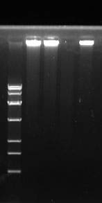 如题。酶是用的Takara公司的LA Taq,用两步法扩的,退火和延伸一个循环用了15min。PCR程序如下:98℃,2min;30 cycles(98℃, 10s; 68℃,15min);72℃,10min。PCR产物有沉淀,用水稀释后,点样,胶图如下,请大家帮忙分析一下,是怎么回事呢?
