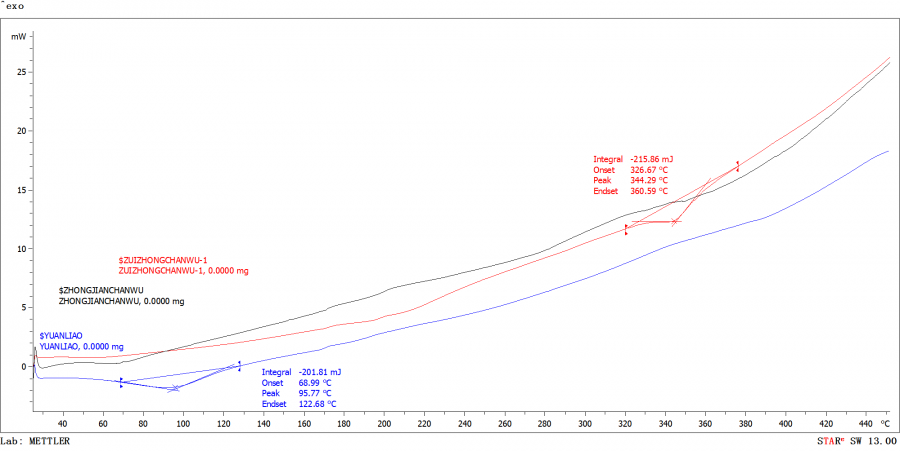 请教大神一下,我的这个DSC曲线是什么意思,分别是原料、中间和最终产物的。曲线上升、在384度有变化说明了什么问题,好像是样品会有一定的膨胀,纵坐标的mW是什么意思啊。是mW/mg的意思嘛? ZONGTU.png |