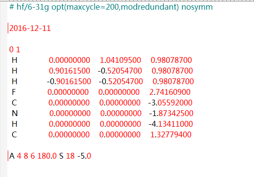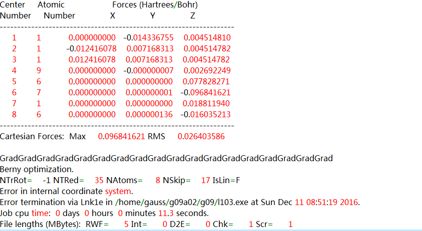 还是出错,这样操作是什么依据呢? 这是报错信息 Cartesian Forces: Max 0.000398598 RMS 0.000132725 GradGradGradGradGradGradGradGradGradGradGradGradGradGradGradGradGradGrad Berny optimization. NTrRot= -1 NTRed= 35 NAtoms= 8 NSkip= 17 IsLin=F Error in internal coordinate system. Error termination via Lnk1e in /home/gauss/g09a02/g09/l103.exe at Sun Dec 11 18:04:34 2016. Job cpu time: 0 days 0 hours 2 minutes 20.5 seconds. File lengths (MBytes): RWF= 10 Int= 0 D2E= 0 Chk= 1 Scr= 1 |