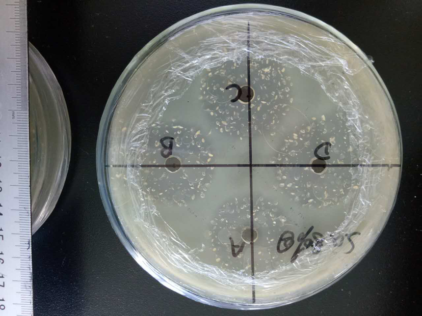 培养了几天?培养时间久了菌也能进入到抑菌圈内的,还有可能就是A处的菌堆积的有点多,我也碰到过这种情况,不过还是记最大半径,A的透明圈跟另外几个相比确实不怎么透明 发自小木虫IOS客户端 |