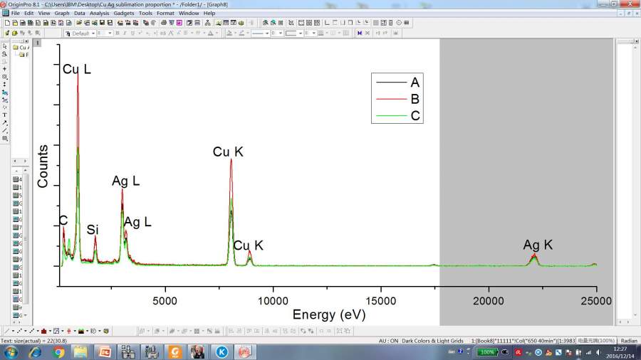 下图是三个CuAg样品的eds mapping的integrated eds谱,想人工计算下CuAg比例变化,请问下如果是按峰面积比,是不是应该先归一化下?另外应该只看K峰或者L峰还是K峰与L峰面积总和之比?非常感谢! http://pan.baidu.com/s/1kU7wxCz |