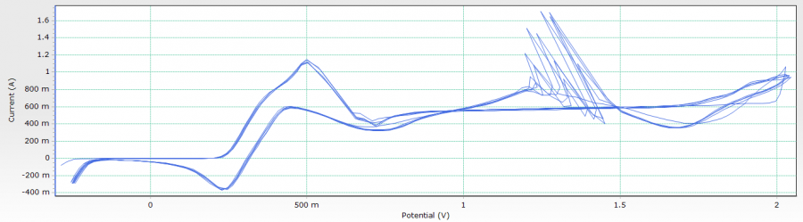 在做循环伏安测试中,阳极电流为正向电流,反扫过程1.5V后,出现锯齿状曲线,也就是电流跳跃特别大。无机溶液,铂电极,采用的三电极测试体系,之前测试没有出现过这样的情况,这一次溶液浓度较大,不知道为何出现这样的情况,是电极的吸附脱附吗? 有遇见这样情况的吗?求帮忙分析,谢谢 一周的.png 五周的.png |