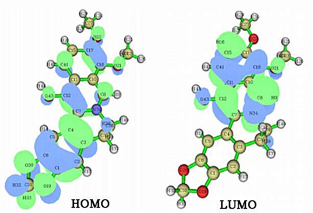 以下是我自己给我回答:The HOMO and LUMO of compound 1 was optimized using density functional theory (DFT) at the B3LYP/6-31G* level. As shown in Fig. 7, the highest occupied molecular orbital (HOMO) and lowest unoccupied molecular orbital (LUMO) of compound 1 are mainly localized on dimethoxy unit and isoquinoline part, respectively. The result indicates that calculated band gap is 2.71eV, which is smaller than berberine (2.89eV), measured in our previous research. Comparsion of PL intensity with the increasing of water fractions, a slight red shift (6 nm) was observed. The red shift of the emission energy from low to high water fraction is likely caused by the C-H…π hydrogen bond and interdipole interactions which decrease the HOMO-LUMO gap. We suggest that this content of HOMO and LUMO theory calculation is unnecessary to show in manuscript because there is no more time and no more AIEE compound of berberine derivatives for us to explore roundly.