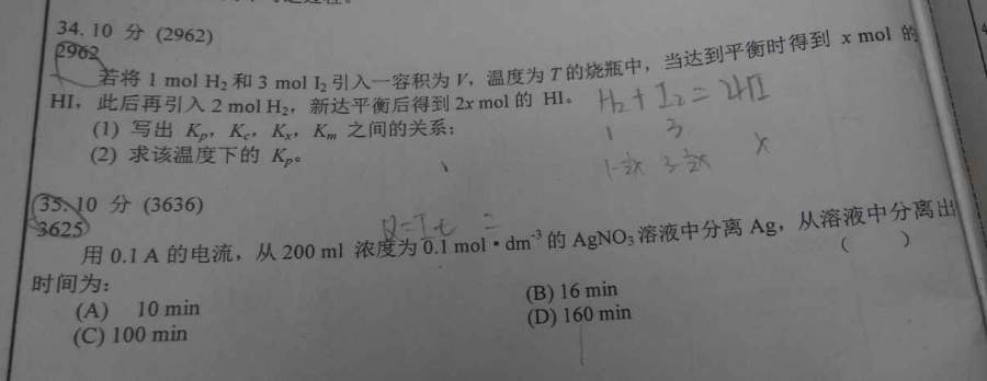 34.根据各个平衡常数的定义可以推导,不懂的话可以看看书。35.根据法拉第电解定律可求所需的电荷量,再用Q=It求时间即可。 发自小木虫Android客户端 |