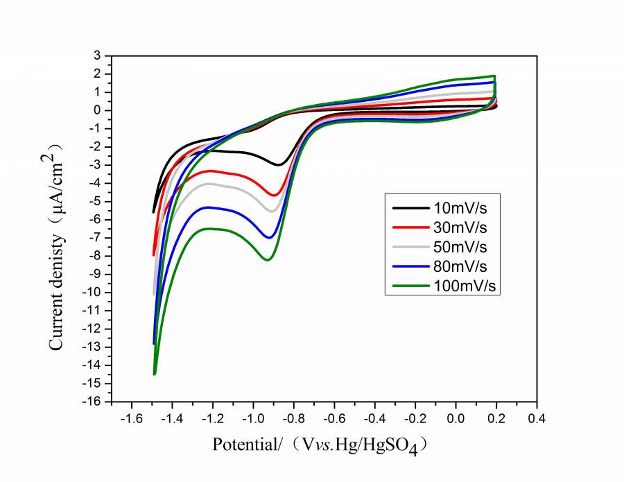 本人刚接触电化学,测试石墨的循环伏安扫描图如下,测试条件为在室温下,电解液为浓度为1 mol/L 的H2SO4溶液,对电极为铂片电极,参比电极为汞/硫酸汞(Hg/HgSO4)电极,分别以10 mV/s,30 mV/s,50 mV/s,80 mV/s,100 mV/s的速率扫描,扫描电位范围为-1.5V~0.2V。想问为什么有一个明显的还原峰,怎么解释,求教各位大神!!! 石墨的CV图.jpg |
