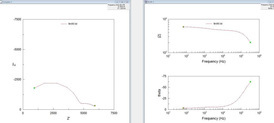 专业是通信电子的,有关课题涉及到了电化学阻抗谱方面 用扫频仪器测量样品(容量较大)的阻抗和相位角,得出的nyqusit和bode图如下: 发现Nyqusit图有俩半圆,但是这bode图怎么一个波峰都没有啊,按道理不是应该至少两个波峰么,是测量频率范围不够么 bode图.jpg |