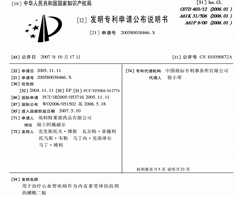请问马西替坦的制剂专利 和 晶型专利都什么时候到期,制剂专利我查的是2005.11.11就有国际申请,推20年的话制剂专利是2025.11.10到期,为什么网上说是2026年到期呢,还有晶型专利最早报道是在期刊上报道晶型,那么是否不存在晶型保护问题呢,还有国外上市情况,只查到美国上市情况,,谁帮忙查下欧盟什么时候上市的啊,以什么名称上市的,重谢! 附图为马西替坦的制剂专利和最早公布晶型的期刊。 @药道人 搜狗截图16年12月16日2002_2.png 搜狗截图16年12月16日2002_3.png |