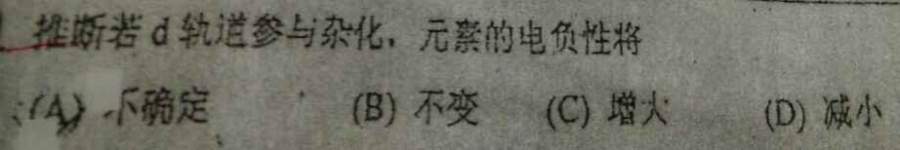 求助大神,这道题选哪个呢,参考答案给的是D,可是我觉得如果内层有电子的d轨道参与杂化,可能电负性是增大的,求大神指教 @jiagle 发自小木虫Android客户端 |