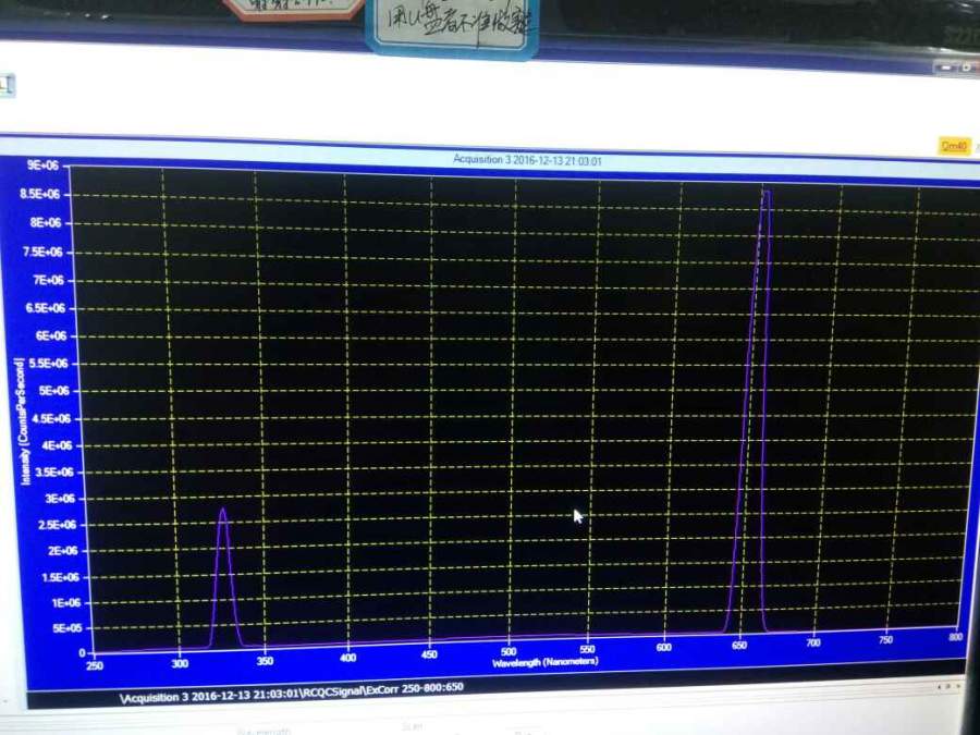 各位好,这是我最近做的某化合物的荧光图 第一张是在650nm激发波做的发射图,第二张是在300nm处发射做的激发波谱图。 感觉像散射峰,荧光强度很小,是不是合成的化合物没有荧光?还是说荧光很弱? 初涉,有点急,请懂的悉心解释下图谱,非常感谢! 发自小木虫Android客户端 |