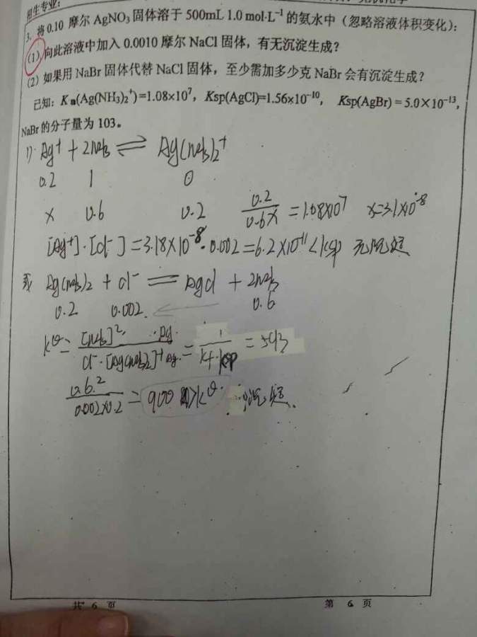 仅从你的计算结果看,900大于K,从何得出有沉淀?思路本身就有问题,应该是根据平衡常数算氯化银的最大溶解度,去判断会不会沉淀。 发自小木虫Android客户端 |