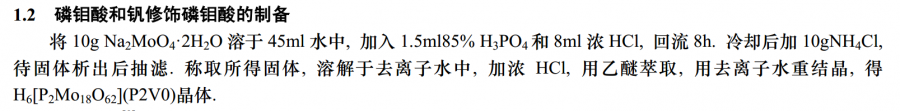 没有找到2:18dawson型的磷钼酸成品,想自己制备,发现文献不多,这是我找到个一个制备方法,但是不是很详细感觉。后边萃取没写浓盐酸和乙醚的量,不知道怎么控制。求助谁有做过这个,或者更详细的文献参考? dawson 磷钼酸制作.png |