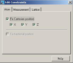 在MS中,用Dmol3计算,固定大部分原子,只在某一局部研究反应过程, 不能只单纯固定XYZ,请问怎样固定原子呢? 为什么Fix fractional position 不能选呢?跟是晶体结构还是分子结构有关系吗? 1.jpg |