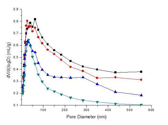 最近做了一组压汞测试:画出了孔径分布图,但是总觉得不太对劲: (1)文献上的图最低点是0,而我的图除了一条曲线是这样,其它的纵坐标都偏高,是怎么回事? (2)曲线平缓处所代表的值是否表明在此处孔径有一定数量的孔,但是不多? (3)dV/dlogD-D和dV/dD-D的图区别很大,是为什么? 捕获1.JPG 捕获2.JPG |