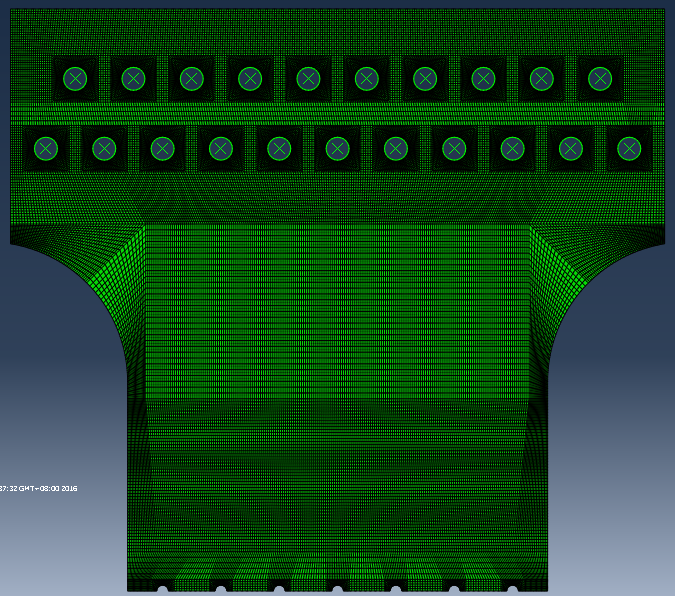请问有做过含孔铝合金板拉伸疲劳试验的吗?请问夹具怎么设计才能保证破坏发生在板中心的孔而不是夹持端螺钉连接的部分?谢谢! 这是我模拟的1/2的模型。原型为包含7个孔的矩形板,采用螺钉与板两端及夹具连接。有限元分析得到的结果显示螺钉孔两边的应力比样件中心的7个孔大20%左右。 |