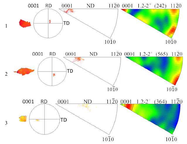 我需要用EBSD区分镁合金的滑移类型,苦于网上文献很少,且讲得很笼统,总结了一下我需要弄清以下问题: 1,用channel5软件将晶粒内两点取向差在1-2°的晶粒区分出来归为子集; 2,计算晶粒内取向差在1-2°两点的取向差轴; 3,将极射投影三角形转换为等面积投影取向三角形; 4,取向三角形中任意一点的晶向指数。 以上都不会,求各位大神,教教我,不胜感激。 这是别人做出来的效果 |