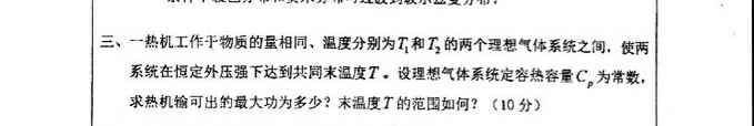 假设这个复合系统(理想气体1 (初始温度T1),理想气体2(初始温度T2),热机)和外界无热量交换,这样的话这个题才有可能做。那么这个复合系统发生的过程为绝热过程。 理想气体的熵是:S=C_p lnT-nRlnP+S_0 n=摩尔数 理想气体1,由温度T1变化为温度T, 其熵的变化为:(∆S)_1=C_p ln T/T_1 理想气体2,由温度T2变化为温度T, 其熵的变化为:(∆S)_2=C_p ln T/T_2 复合系统的总的熵变必须大于等于0:(∆S)_1+(∆S)_2=C_p ln T^2/(T_1T_2)≥0 由上式可得:T^2≥T_1T_2, 即T≥√(T_1T_2) 对复合系统运用热力学第一定律得:C_v (T-T_1 )+C_v (T-T_2 )=W W=外界给符合系统做功, -W=C_v (T_1+T_2-2T )≥C_v (T_1+T_2-2√(T_1T_2) ) 即答案 C_v=C_P-nR |