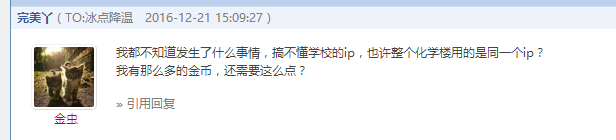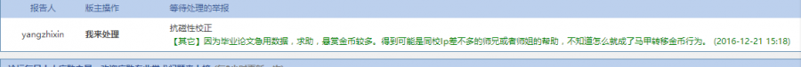 ID:yangzhixin ID:完美丫 两位IP地址前3组相同,最后一个分别为252和253。 分别在1楼和2楼,转移金币数量为500 【马甲帖链接】 抗磁性校正 - 无机/物化 - 小木虫论坛 https://muchong.com/bbs/viewthread.php?tid=10920141 【马甲ID解释】 “【其它】因为毕业论文急用数据,求助,悬赏金币较多。得到可能是同校Ip差不多的师兄或者师姐的帮助,不知道怎么就成了马甲转移金币行为。 (2016-12-21 15:18)” 【判定类型】 根据化工区规定,ID @yangzhixin @完美丫 属于典型马甲应助行为。 【处罚结果】 根据两者提供的描述,判断其行为属于马甲行为,但不进行马甲处罚,扣除2楼所得金币,1楼金币不予以退还。如有异议,请回帖提出。 [ Last edited by 江南的竹 on 2017-1-13 at 13:11 ] |