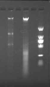 第一幅图是问题条带,三条带的距离怎么这么大?第二幅图是比较正常的图。用的都是1%的琼脂糖电泳。第一幅图使用赛默飞的试剂盒提的,第二幅图用赛默飞的Trizol试剂提的。 求解释第一幅图原因,可以做反转录cDNA实验么? 发自小木虫Android客户端 |