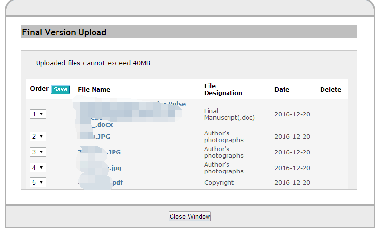 如题 第一次提问 请问,我的现在需要上传终稿 但是上传系统最终页面是这样的 总是显示“files cannot exceed 40M” 但上传文件总共不超过15M 也不知道上传成功没有 求解释 不甚感激 急急急 周二到期 给编辑发过邮件 但是还没有回复 好捉急 看图片里的页面 也没有办法进行文档上传变更,没法删除了更改了 好捉急 终面40.png 终面41.png |