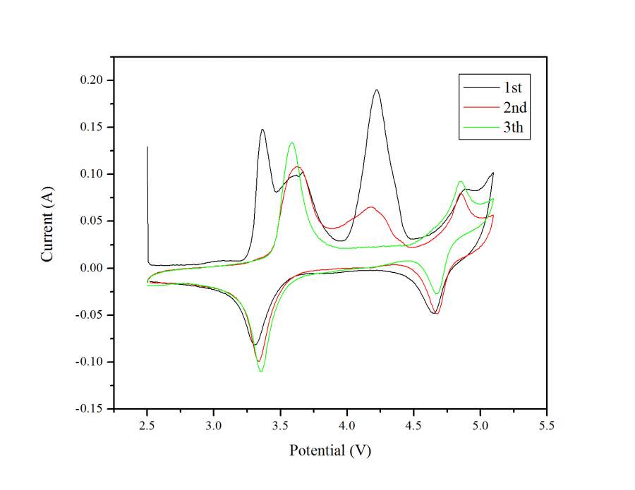 各位大神,求助一下这个CV图谱解析。本人新做的正极材料Fe掺杂的LiCo1-xFexPO4,装电池扫的CV,跪求大神帮忙看下,为啥4.6V处的还原峰3次的变化是越来越小,而3.3V处的确实逐渐增大?另外,其他氧化峰如何解释?杂质吗?