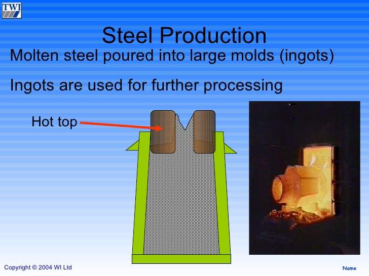 鋼定直立鑄造時,因為頂部會出現縮孔,所以一般會在頂部做一個熱冒口(Hot top),目的就是用?硌a充頂部的鋼液,讓縮孔產生於熱冒口內,然後凝固後切除冒口,得到完美的鋼錠。